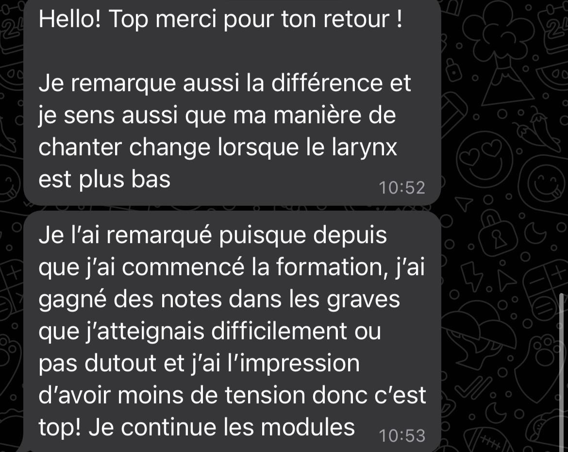 Les informations et ressources fournies, les training vocaux et les différents contenu gratuit, sont uniquement à titre informatif et pédagogique. Bien que je fournisse des outils et des techniques pour améliorer votre voix et votre performance, les résultats peuvent varier selon chaque individu. Je ne peux garantir un résultat spécifique ni être tenu responsable des progrès ou des difficultés que vous pourriez rencontrer au cours votre apprentissage vocal dans le cadre des différents contenus gratuits.